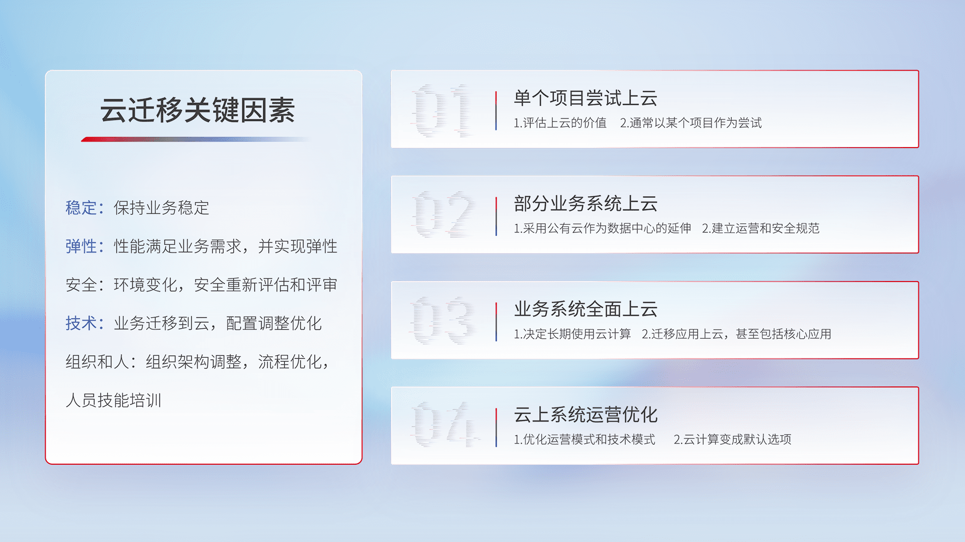 结合实际业务,,,从规划设计、、、云平台选型、、、云原生改造、、、数据迁移、、集成交付,,迁移全过程为客户识别最佳上云路径,,,做好风险识别管理,,,设计网络架构、、、、身份权限、、、安全审计合规、、、操作审计、、、、日志审计、、监控告警策略、、、多站点容灾设计等,,,,对云上基础设施进行整体规划,,,,提升IT治理水平,,,以满足弹性、、、、高可用、、高性能的需求。。。。
